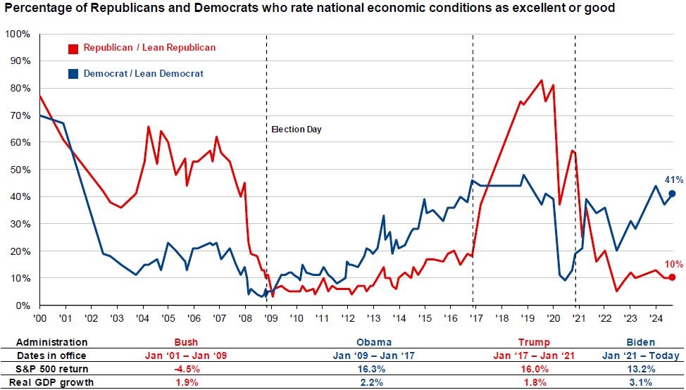 First, markets are forward-looking and often already price in anticipated political outcomes. First level thinking like “Clean energy = good for Harris”, and “Oil and gas = good for Trump” ignores both the complexity and forward looking nature of markets. This is the reason for the classic market adage “sell the news”. Second, market movements are more heavily influenced by fundamental economic factors like interest rates, corporate earnings, and global events rather than transient political shifts. Finally, studies have shown that market returns do not consistently favor one political party over another, and the long-term trend of the market has been upward regardless of the party in power.