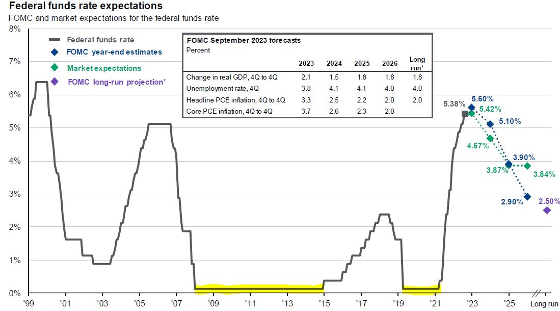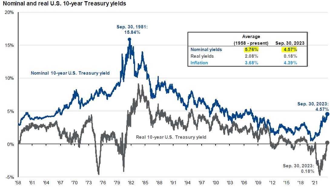 While this scenario is scary, it is far from a likely outcome. Inflation and the ability for the Federal Reserve to contain it remain key to the ability to normalize rates. There is good news on this front, as the trajectory of inflation remains lower. Note that the current treasury rate of 4.58% as of 9/30 is less than the long-term average since 1958. While the yield has risen from less than 1% during the Covid lows to approximately 4.7%, the economy at large has so far absorbed the higher rate environment without significant collateral damage.