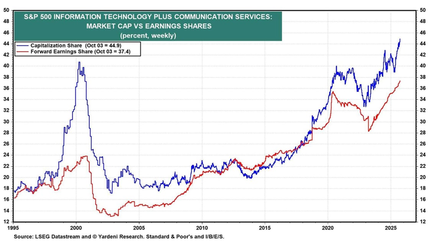 The Information Technology and Communication Services sectors now account for a record 44.9% of the S&P 500’s market capitalization—exceeding the 40.7% peak seen during the dot-com era.