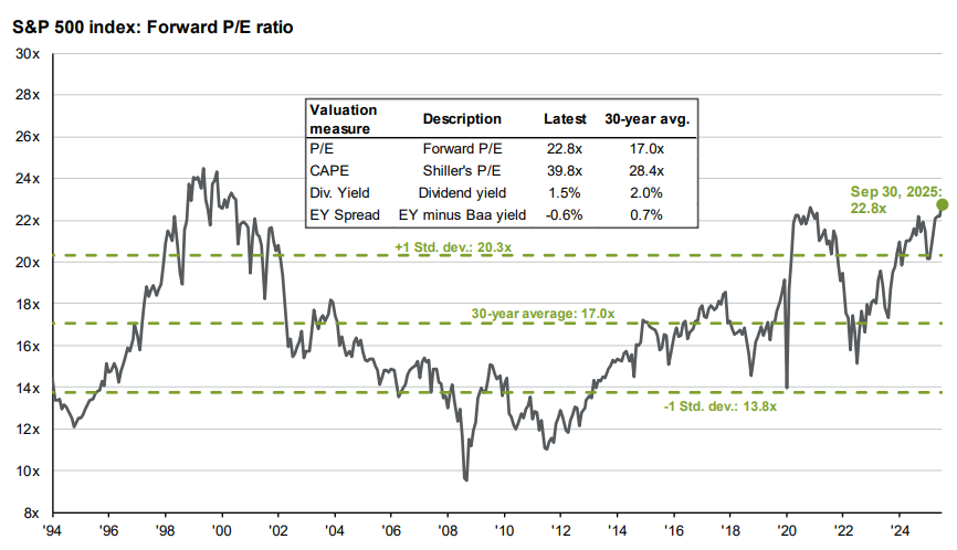 The S&P 500’s forward P/E ratio reached 22.8 at the end of September, uncomfortably close to the 25.0 peak of the 1999 tech bubble.