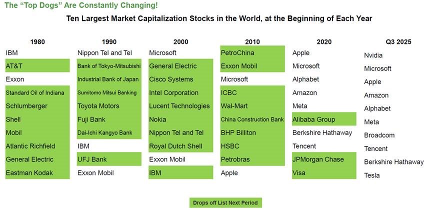By the 2000s, the internet boom gave way to a bust. Leadership shifted again, this time to value-oriented and non-U.S. stocks. China’s acceptance into the World Trade Organization in 2001 ushered in a surge of global trade, infrastructure demand, and commodity strength. By the end of the 2010s, the world’s largest companies included several commodity producers and Chinese banks—symbols of the now-prevailing “China boom.”