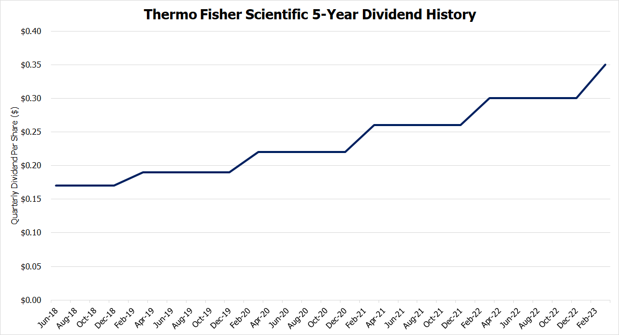 Then in 2018, Thermo Fisher started growing their dividend in earnest. Over the last 5-years, they’ve grown their quarterly dividend at a compound annual growth rate of 15.54%.