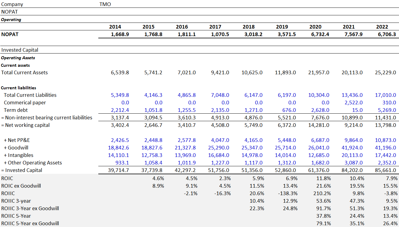 2020 and 2021’s ROIC and ROIIC were positively skewed by the Covid pandemic. ROIIC is coming back down as profits and NOPAT normalize but they still remain high and on-trend with Thermo Fisher’s pre-Covid years.